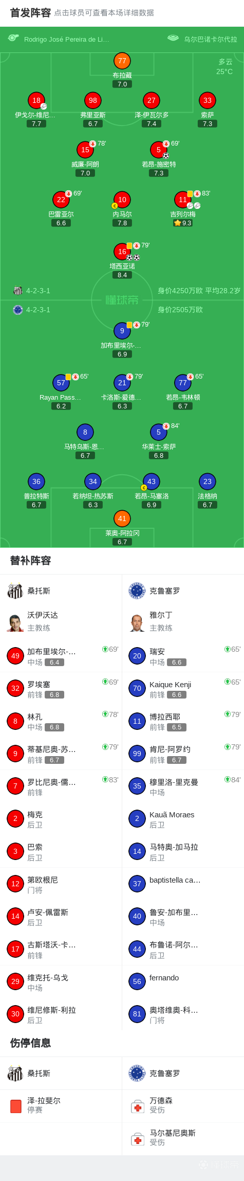 第28分钟,伊戈尔-维尼修斯助攻,塔西亚诺推射破门完成双响,桑托斯2-0