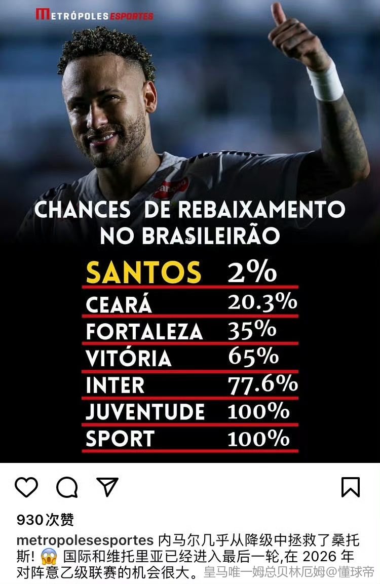 北京时间12月8日,在2025赛季巴甲的末轮比赛中,桑托斯主场3-0完胜克鲁塞罗,最终在联赛最后三轮取得全胜的情况下成功保级,本场比赛内马尔再次首发并且打满了全场,表现也同样出色。