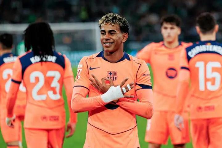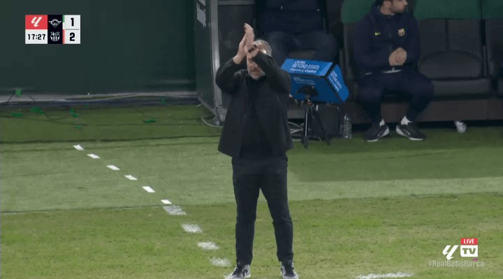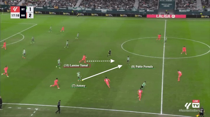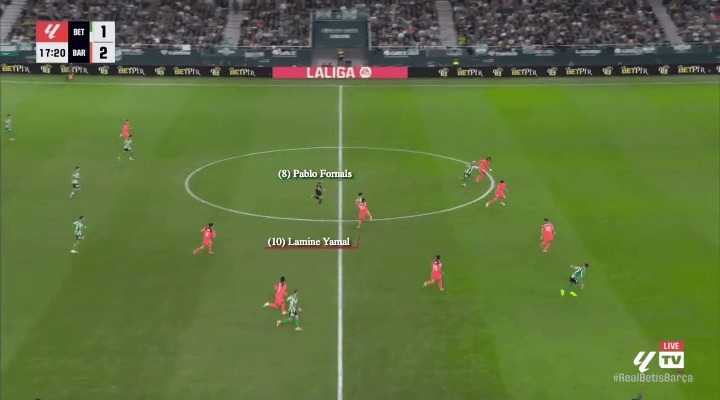 凭借一个假动作、良好的控球和爆发性的速度,亚马尔轻松甩开了所有防守队员。阿尔蒂米拉为了阻止反击不得不对他犯规,吃到一张黄牌,皇家贝蒂斯主教练佩莱格里尼不得不在中场休息时将他换下。