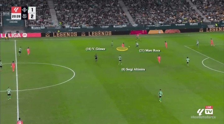 他的个人天赋令人难以招架,如下图所示,这位18岁的小将在进攻组织阶段即将接到孔德的传球。当时有三名贝蒂斯球员正在观察他。