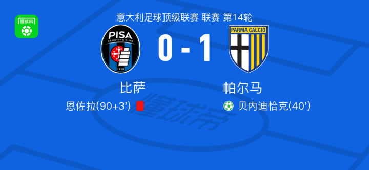 北京时间12月8日,意大利足球顶级联赛第14轮,比萨坐镇主场迎战帕尔马。比赛中,帕尔马球员贝内迪恰克主罚点球命中,为球队取得领先。下半场补时阶段,比萨球员恩佐拉被红牌罚下。最终全场比赛结束,比萨0-1不敌帕尔马。