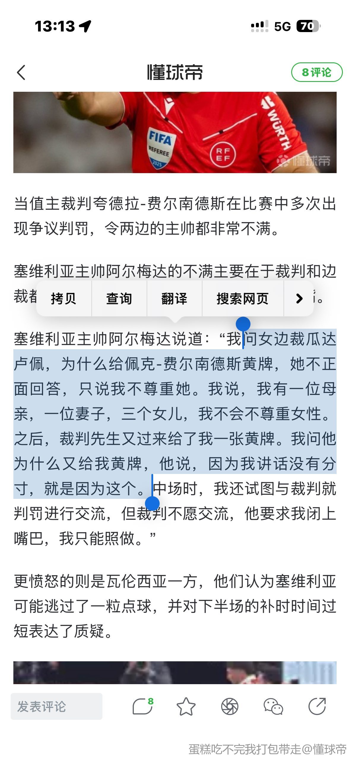 塞维利亚主帅阿尔梅达的不满主要在于裁判和边裁都不愿意为黄牌给出解释,只要求自己闭嘴。