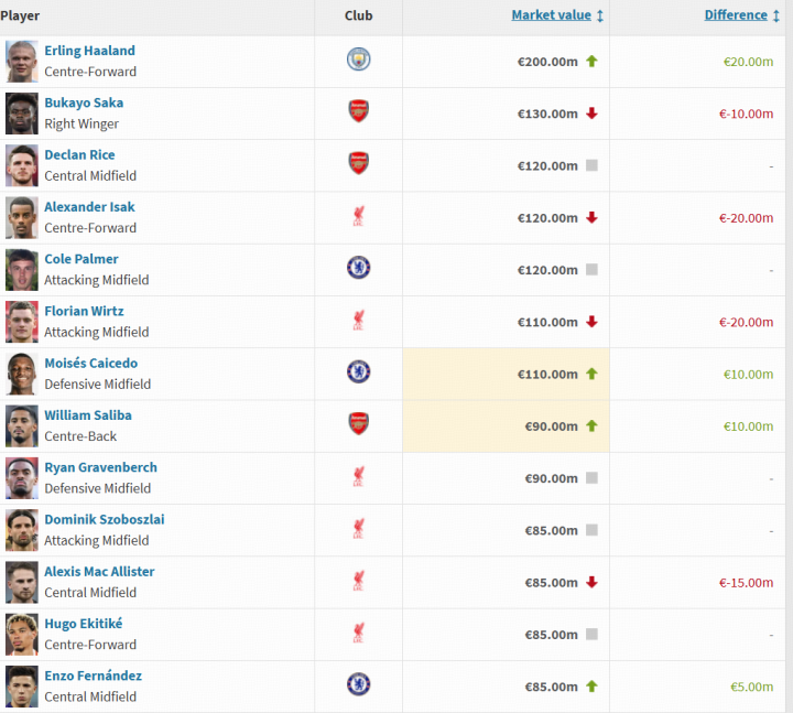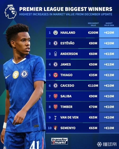 哈兰德涨至2亿欧继续位居首位。萨卡下跌1000万欧降至1.3亿欧。赖斯、帕尔默身价仍为1.2亿排名第三。伊萨克身价下跌2000万,身价同为1.2亿。