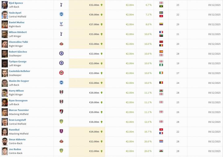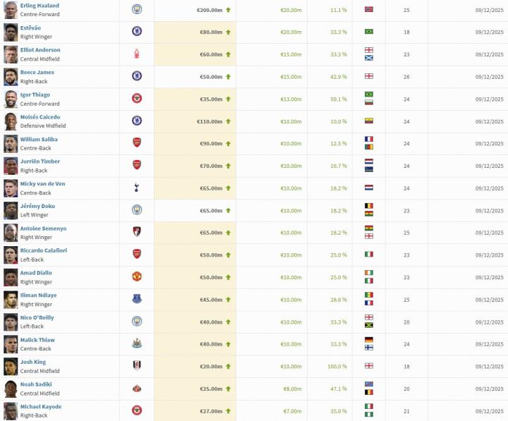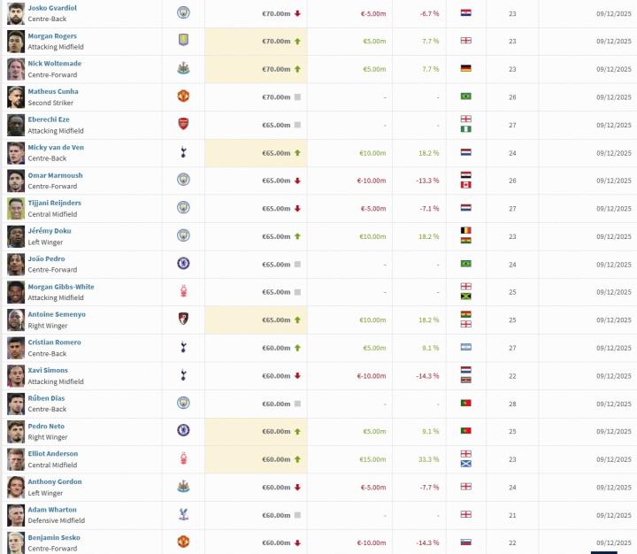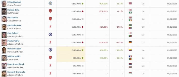 哈兰德涨至2亿欧继续位居首位。萨卡下跌1000万欧降至1.3亿欧。赖斯、帕尔默身价仍为1.2亿排名第三。伊萨克身价下跌2000万,身价同为1.2亿。维尔茨身价下跌2000万欧,身价达1.1亿欧。凯赛多身价身价上升1000万,同为1.1亿欧。麦卡利斯特身价下跌1500万欧,跌破1亿来到8500万欧元。