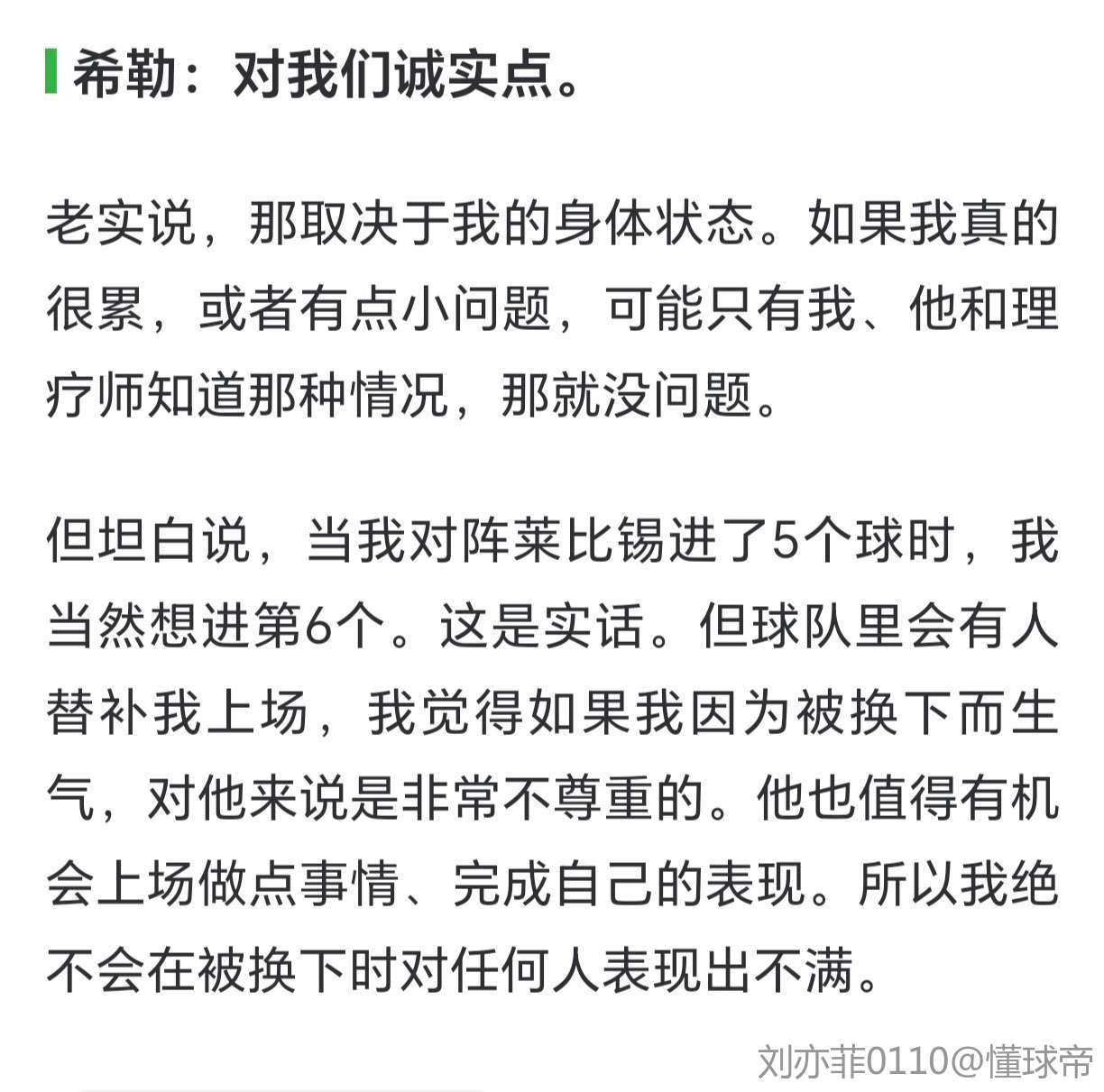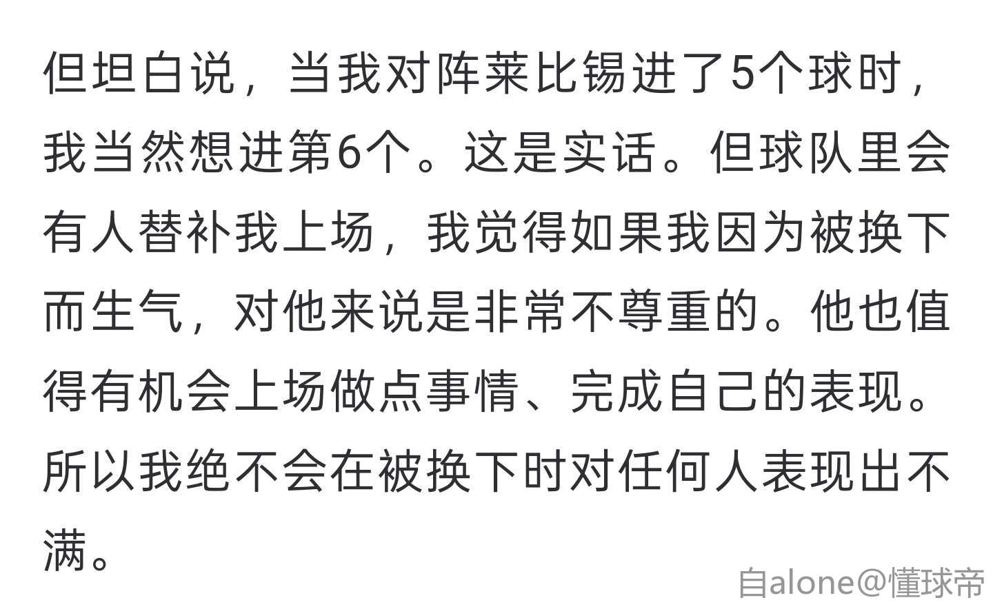 但坦白说,当我对阵莱比锡进了5个球时,我当然想进第6个。这是实话。但球队里会有人替补我上场,我觉得如果我因为被换下而生气,对他来说是非常不尊重的。他也值得有机会上场做点事情、完成自己的表现。所以我绝不会在被换下时对任何人表现出不满。
