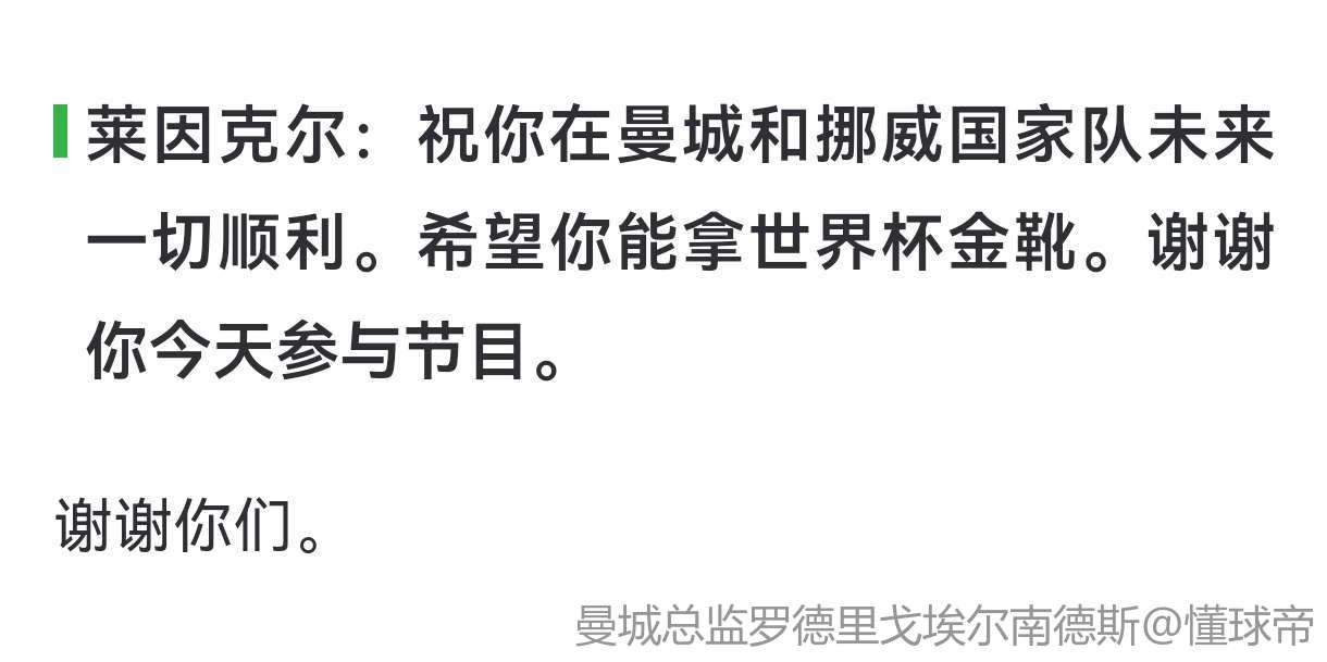 莱因克尔:祝你在曼城和挪威国家队未来一切顺利。希望你能拿世界杯金靴。谢谢你今天参与节目。