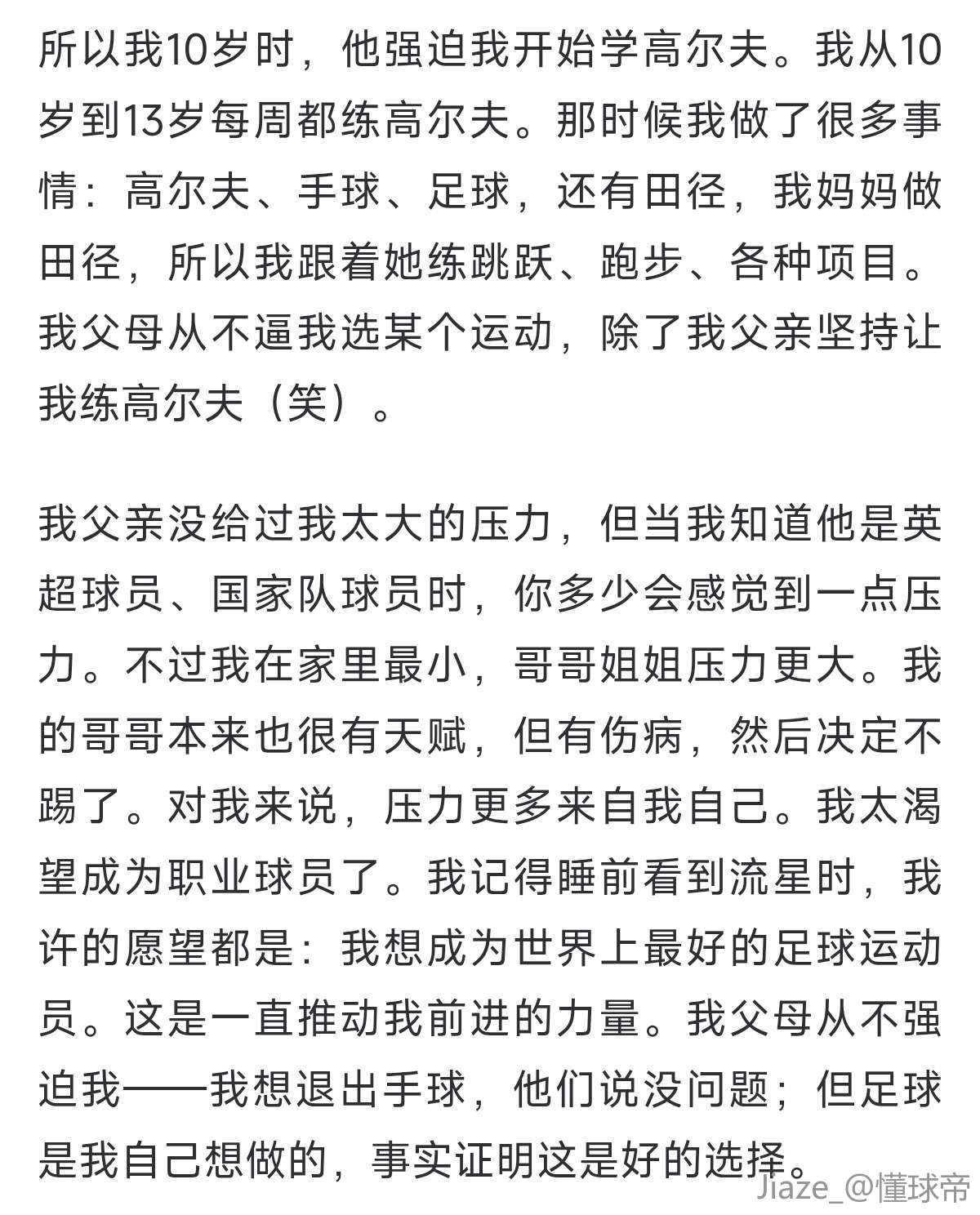 我父亲没给过我太大的压力,但当我知道他是英超球员、国家队球员时,你多少会感觉到一点压力。不过我在家里最小,哥哥姐姐压力更大。我的哥哥本来也很有天赋,但有伤病,然后决定不踢了。对我来说,压力更多来自我自己。我太渴望成为职业球员了。我记得睡前看到流星时,我许的愿望都是:我想成为世界上最好的足球运动员。这是一直推动我前进的力量。我父母从不强迫我——我想退出手球,他们说没问题;但足球是我自己想做的,事实证明这是好的选择。