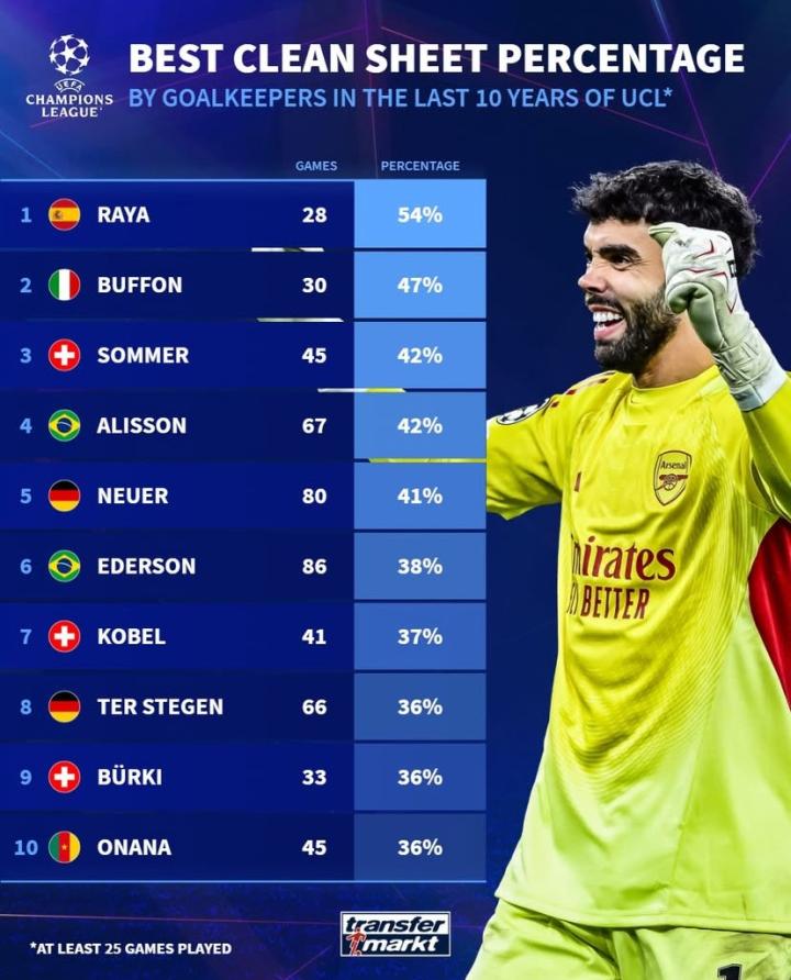 扫描下载懂球帝首页>动态> 近10年欧冠门将零封率:拉亚54%第1,布冯47%第2,奥纳纳上榜