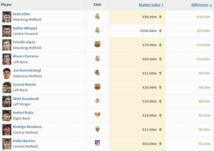 扫描下载懂球帝首页>动态> 德转西甲身价涨幅榜:居莱尔上涨3000万欧,姆巴佩上涨2000万欧