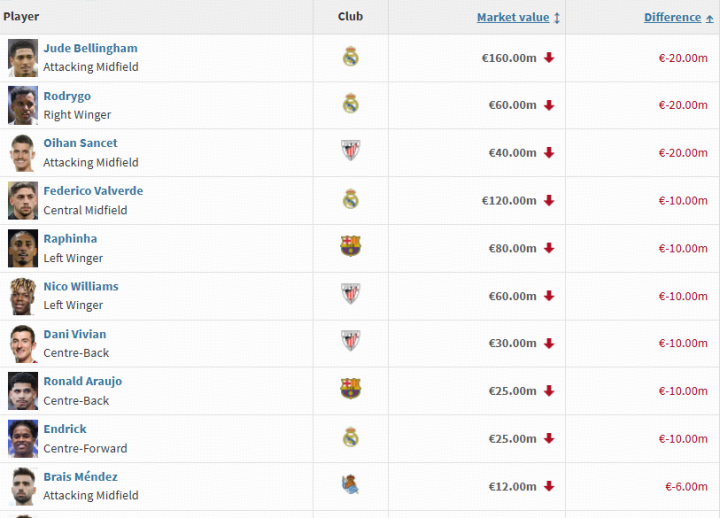 扫描下载懂球帝首页>动态> 西甲身价跌幅榜:贝林、罗德里戈下跌2000万欧