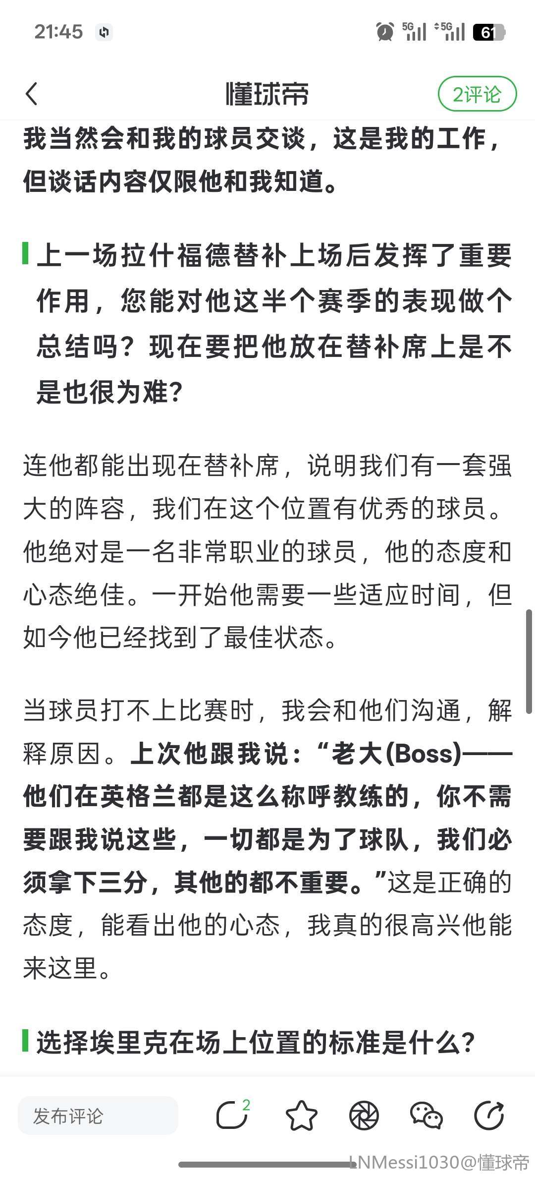 当球员打不上比赛时,我会和他们沟通,解释原因。上次他跟我说:“老大(Boss)——他们在英格兰都是这么称呼教练的,你不需要跟我说这些,一切都是为了球队,我们必须拿下三分,其他的都不重要。”这是正确的态度,能看出他的心态,我真的很高兴他能来这里。
