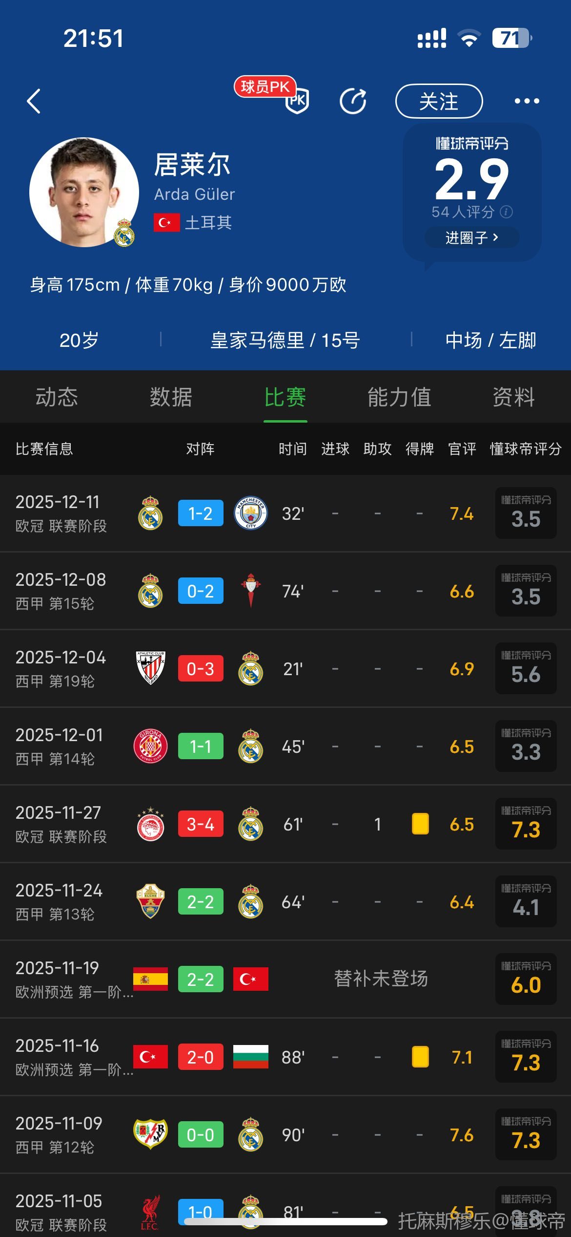 12-12 20:10德转解释皇马身价变动:罗德里戈几乎没贡献;居莱尔进步明显