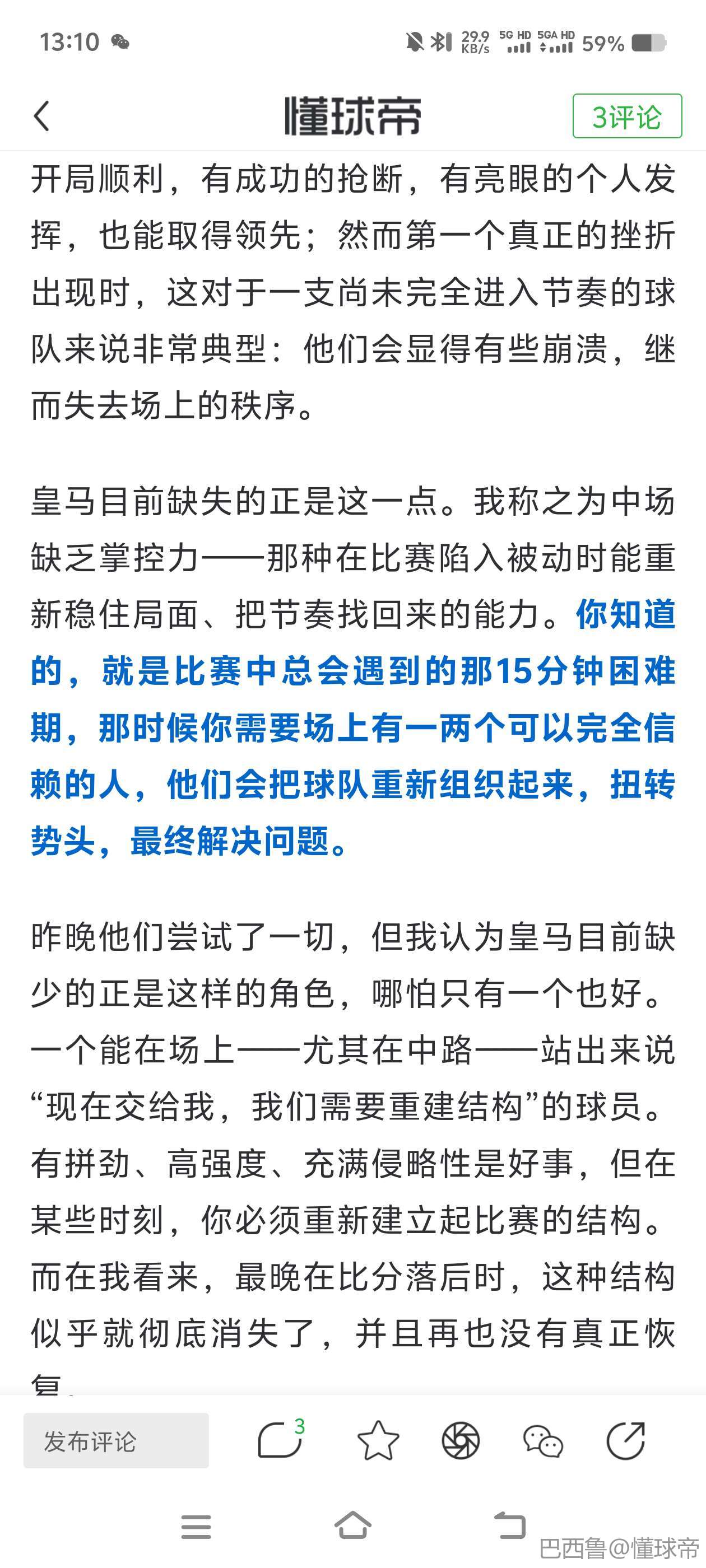 对我来说,比赛的关键转折点出现在皇马落后之时——那时我确实感觉到他们缺少了一些东西。你能明显察觉到,球队的节奏和信心又开始动摇了。
