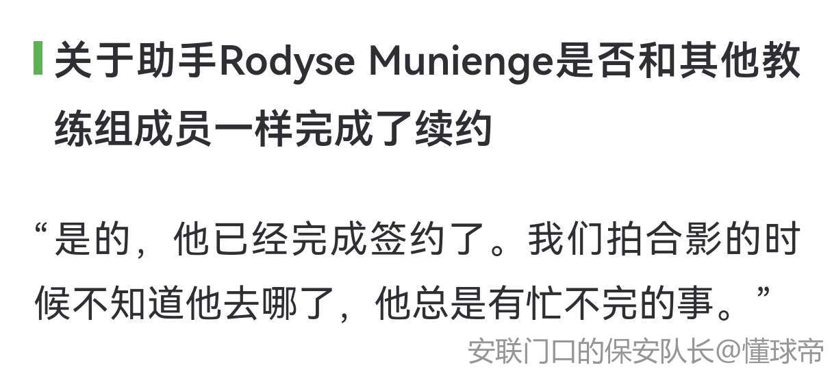 关于助手Rodyse Munienge是否和其他教练组成员一样完成了续约