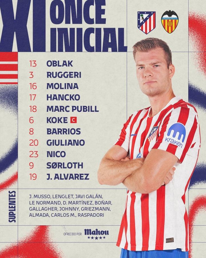 北京时间12月13日21点,西甲第16轮马德里竞技对阵瓦伦西亚,赛前公布首发名单。