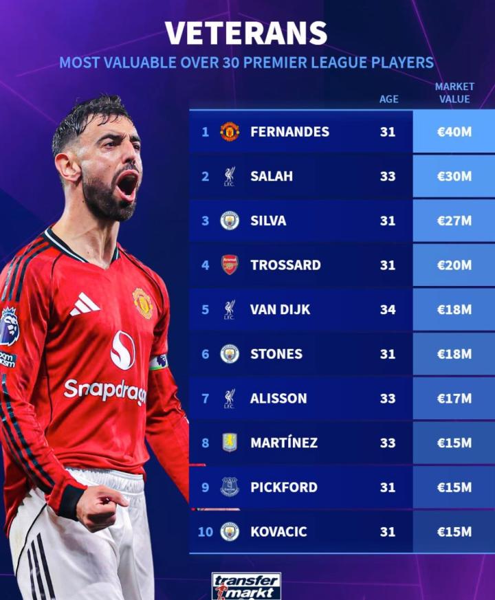 扫描下载懂球帝首页>动态> 英超30岁以上球员身价榜:B费4000万欧第1,萨拉赫3000万第2