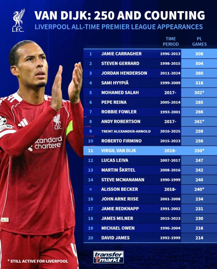 扫描下载懂球帝首页>动态> 利物浦英超出场数TOP20:卡拉格508场第1,范戴克250场第11
