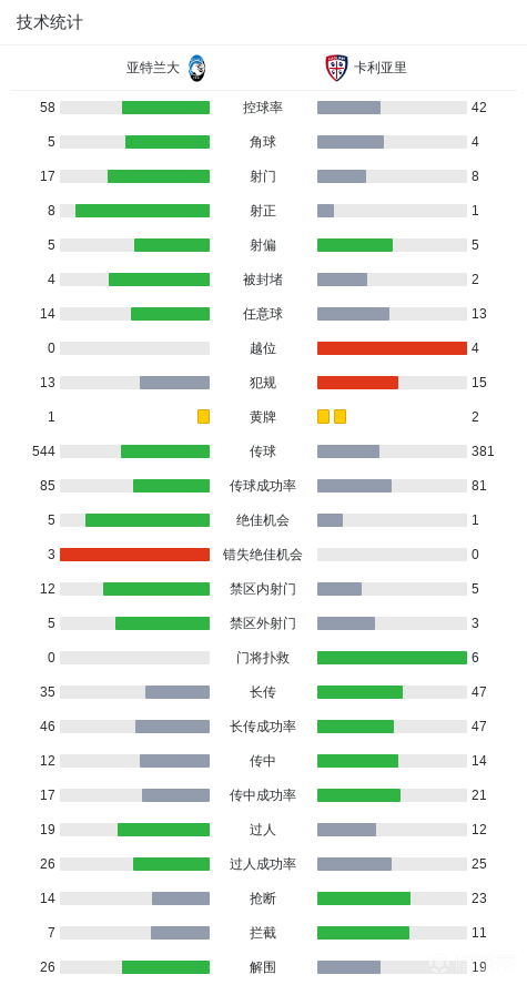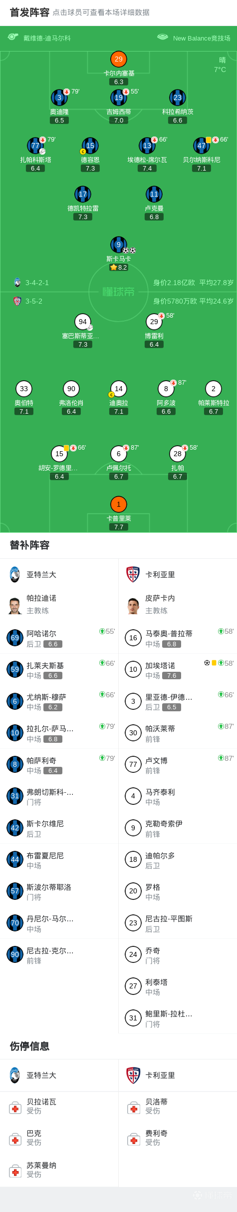 北京时间12月14日,意大利足球顶级联赛第15轮,亚特兰大坐镇主场迎战卡利亚里。上半场,扎帕科斯塔送出精准助攻,斯卡马卡破门,率先打破场上平衡。下半场,塞巴斯蒂亚诺-埃斯波西托为加埃塔诺创造良机,后者抓住机会扳平比分。比赛后段,斯卡马卡再度建功,完成梅开二度,助球队重获领先。补时阶段,卢文博的进球被吹越位。最终,亚特兰大 2-1 战胜卡利亚里。