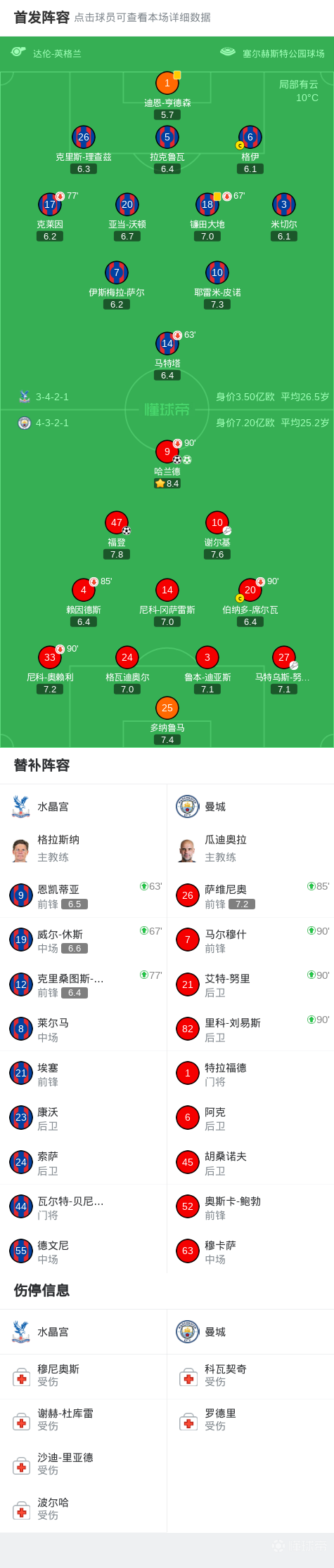 总的来说水晶宫阵容深度还是太有限了,基本就是一套阵容来打,特别是这中场两个中前卫没法换,上了修斯后防守拦截控制的平衡性就没那么好了,曼城这边在缺少边路超级爆点多库的情况下,显得左边路还是没那么犀利,莱因德斯有发挥他前插的特点,但他禁区拿下处理不够好,而且他不适合边锋,所以福登上半场时不时被挤到左边上,但效果并不好,曼城这场主要胜在转化能力上,这也是球员质量身价的体现