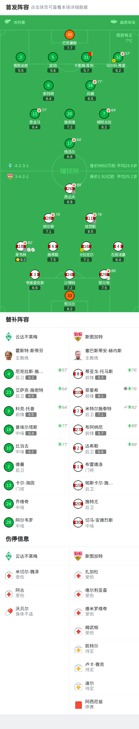 第40分钟,斯图加特球员莱韦林助攻哈努斯打入一球。
