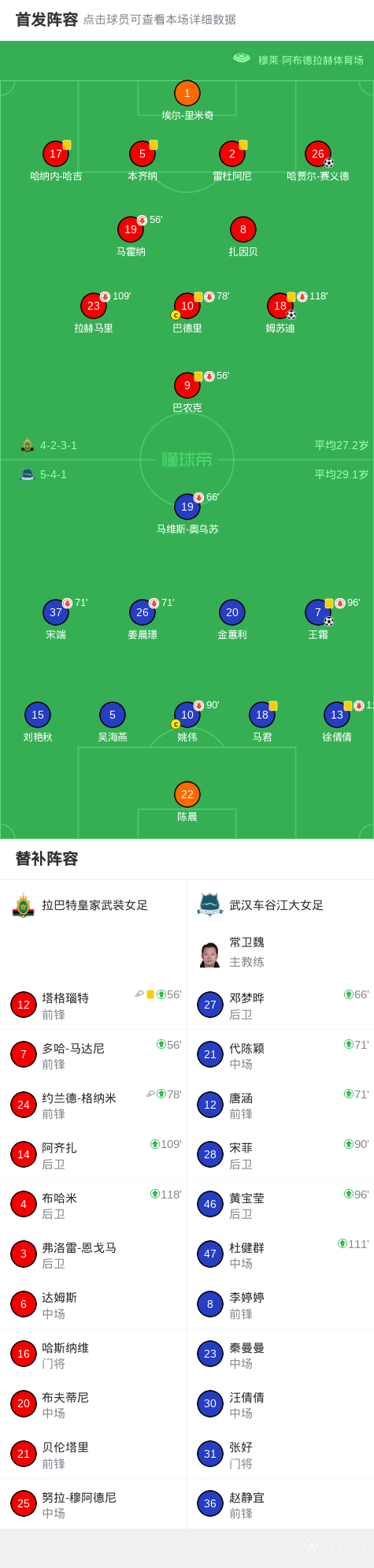北京时间12月15日,FIFA女冠杯第二轮,拉巴特皇家武装女足对阵武汉车谷江大女足。比赛中,王霜小角度爆射首开记录,哈贾尔-赛义德头槌绝平将比赛拖入加时。加时赛中,姆苏迪一击制胜。最终,武汉女足1-2不敌拉巴特皇家武装女足,无缘FIFA女冠杯决赛阶段。