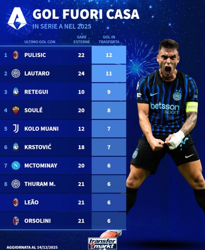 扫描下载懂球帝首页>动态> 意甲球员2025年客场进球榜:普利希奇12球第1,劳塔罗11球第2