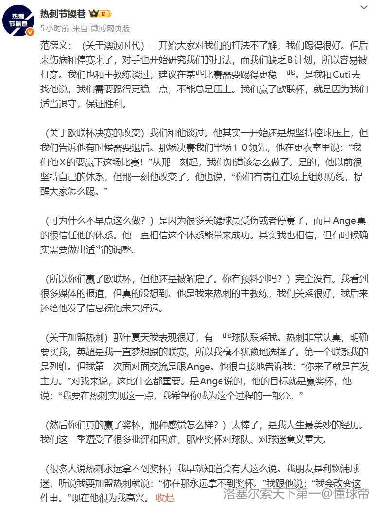 扫描下载懂球帝首页>动态> 范德芬:我没料到澳波在拿到欧联杯后被解雇,我仍然很喜欢他