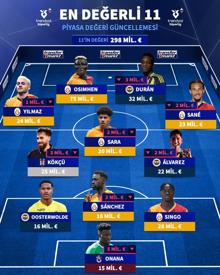 萨内(加拉塔萨雷)2300万欧元、杜兰(费内巴切)3200万欧元、奥斯梅恩(加拉塔萨雷)7500万欧元、巴里什-伊尔马兹(加拉塔萨雷)2400万欧元