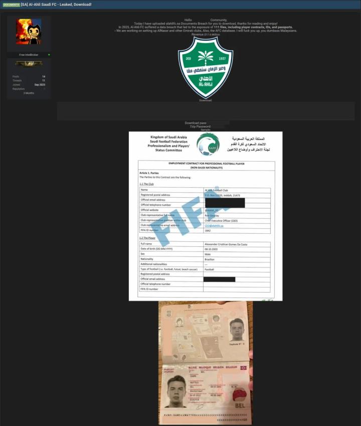 据报道,吉达国民遭遇了一次重大的数据泄露事件。此次事件涉及未经授权的内部文件外泄,这些文件随后被发布在一个知名的暗网论坛上。黑客声称已从该俱乐部的系统中获取了超过111份文件,并表示有意针对其他中东地区的高知名度足球俱乐部以及亚足联的数据库发起攻击。
