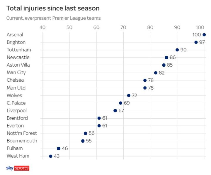 图源:天空体育 | 自上赛季以来的伤病总数(当前英超参赛球队)