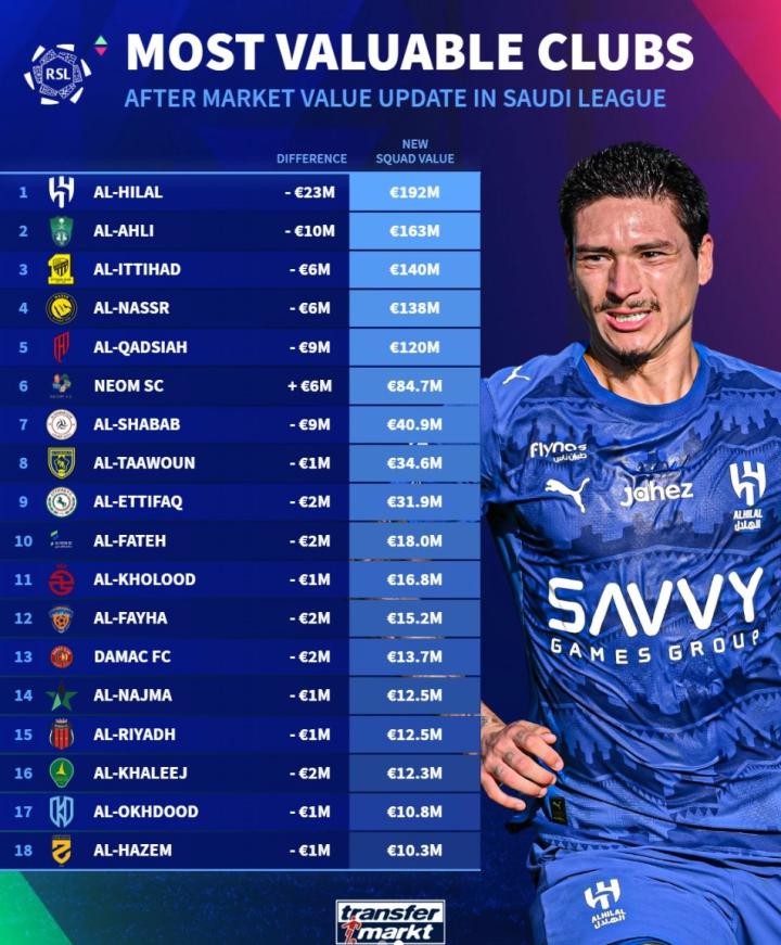 扫描下载懂球帝首页>动态> 德转沙特俱乐部身价:新月1.92亿第1,胜利第4,最低仅1030万