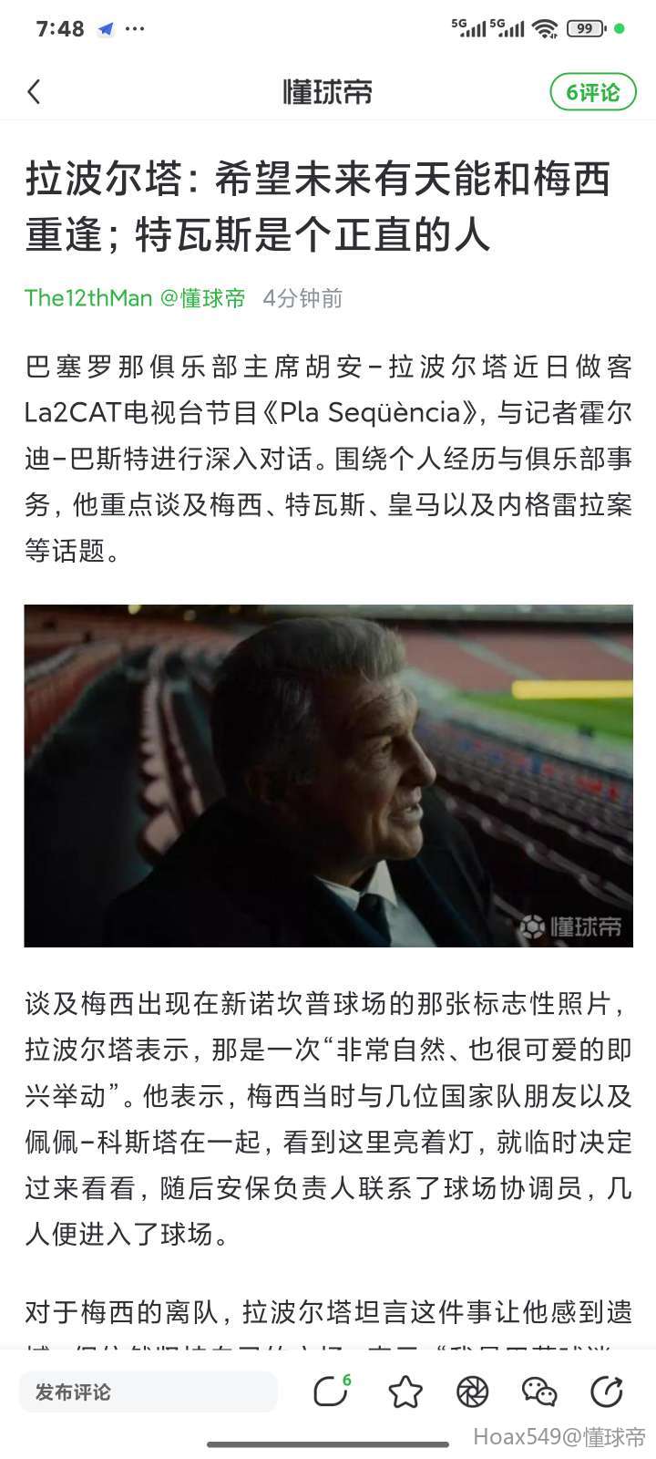 拉波尔塔:希望未来有天能和梅西重逢;特瓦斯是个正直的人