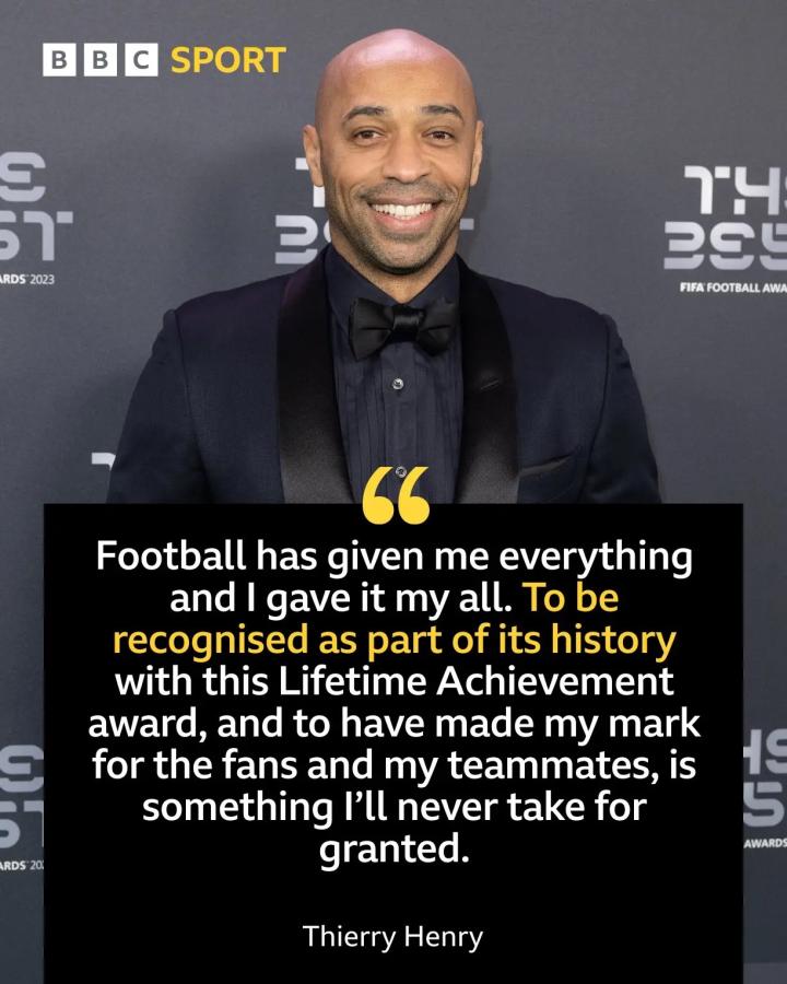 “蒂埃里作为史上最伟大的足球运动员之一的成就,使他当之无愧地荣获BBC年度体育人物终身成就奖。”