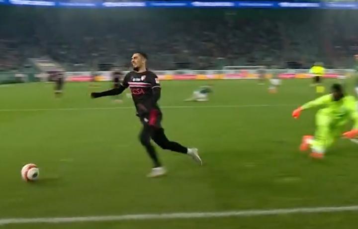 在比赛中,舒阿勒夫接到对手的乌龙解围后,盘开了对手门将,但是射门的角度比较小,他在往底线又带了一步后,突然摔倒,但是这一下实在太过滑稽,连他自己都被逗笑了,他也向队友竖起拇指来掩饰尴尬。