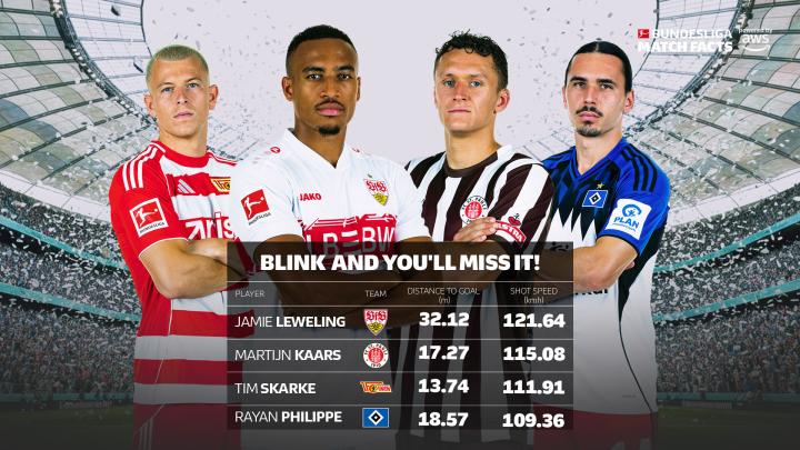 上周末比赛中,斯图加特中场杰米·莱韦林以121.64公里/小时的射门时速高居榜首,比第二快射门高出6公里/小时。