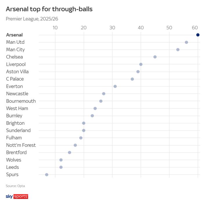但他的队友们正在尝试。根据Opta数据,阿森纳本赛季的直塞球次数是英超各队中最多的。他们的场均直塞数从上赛季的略高于2次大幅提升至本赛季的近4次,增幅近80%,这反映了球队在增加传球穿透性方面所做的共同努力。