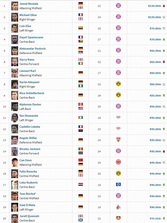 扫描下载懂球帝首页>动态> 德甲身价更新:穆西亚拉&奥利塞1.3亿欧并列第一,凯恩6500万欧