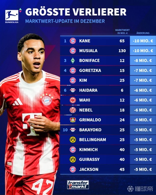 12-19 20:42德甲球员身价下跌榜:穆西亚拉、凯恩跌1000万欧并列第一