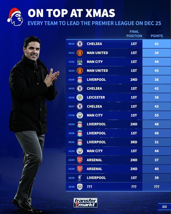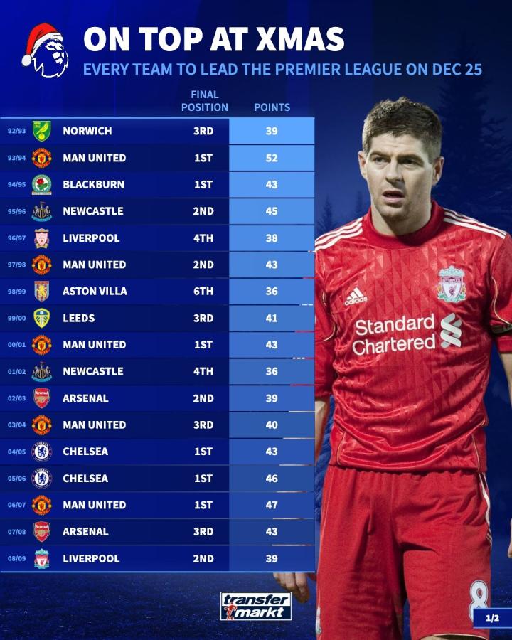 扫描下载懂球帝首页>动态> 英超33支圣诞节登顶的球队有17支夺冠,近7年仅3队夺冠
