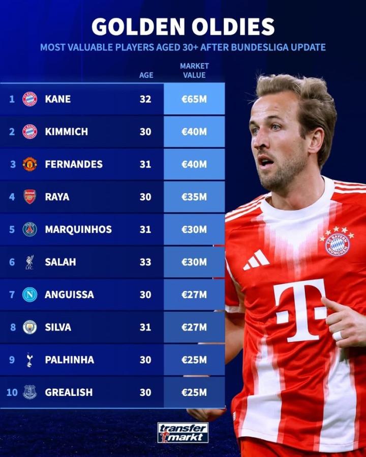 扫描下载懂球帝首页>动态> 德转30岁以上球员身价榜:凯恩6500万第1,基米希、B费第2