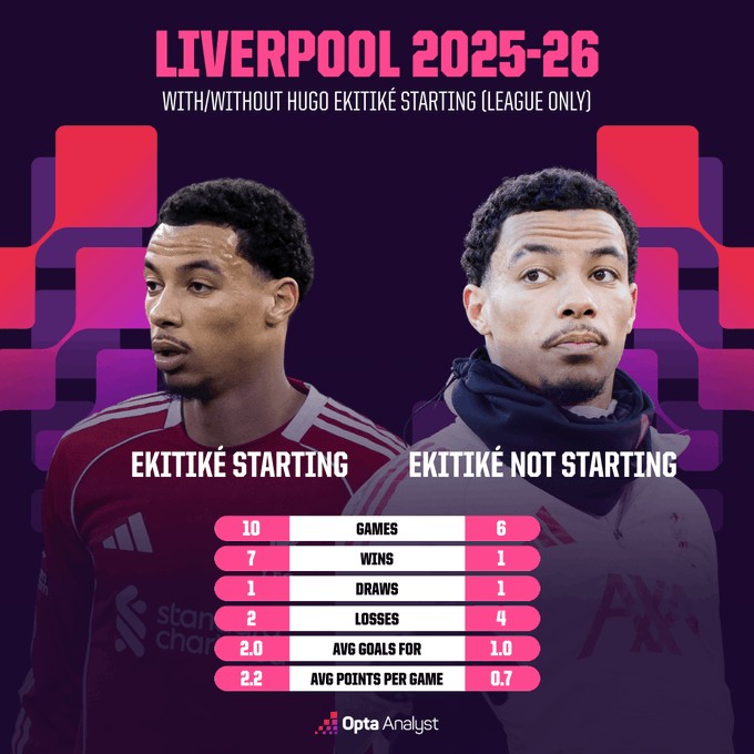 扫描下载懂球帝首页>动态> 埃基蒂克本赛季英超首发时利物浦10战7胜,未首发时6战4负
