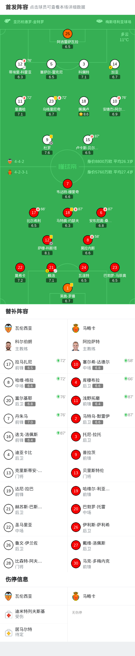 瓦伦西亚vs马略卡:加亚、阿吉雷萨瓦拉首发,韦达特-穆里奇、巴勃罗-马菲奥出战