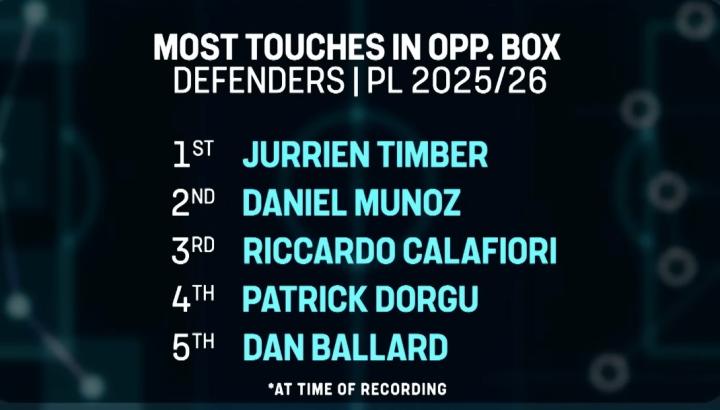 你在禁区内的触球次数,在英超后卫中也名列前茅。