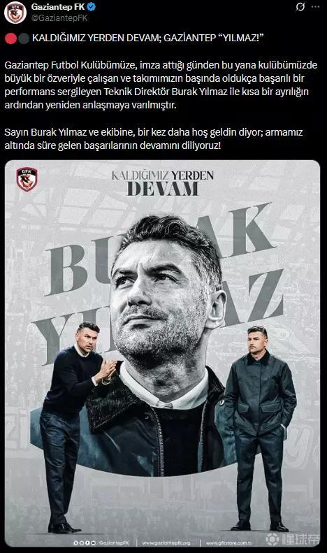 加济安泰普足球俱乐部在官方声明中指出:“我们再次与主教练布拉克·伊尔马兹达成一份短期协议。自他签约以来,一直兢兢业业地为俱乐部工作,并在执教球队期间取得了非常成功的战绩。
