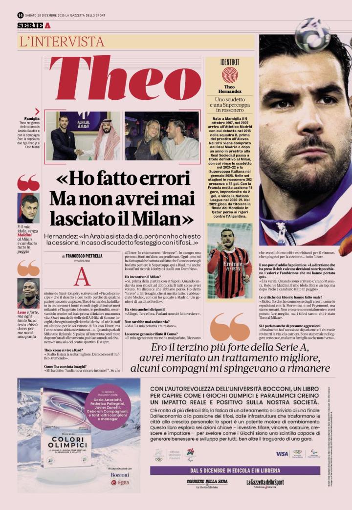 近日,法国国脚特奥-埃尔南德斯接受了米兰体育报的专访,他的完整采访内容将在明天(20日)的米兰体育报上刊登: