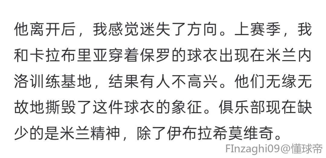 他离开后,我感觉迷失了方向。上赛季,我和卡拉布里亚穿着保罗的球衣出现在米兰内洛训练基地,结果有人不高兴。他们无缘无故地撕毁了这件球衣的象征。俱乐部现在缺少的是米兰精神,除了伊布拉希莫维奇。
