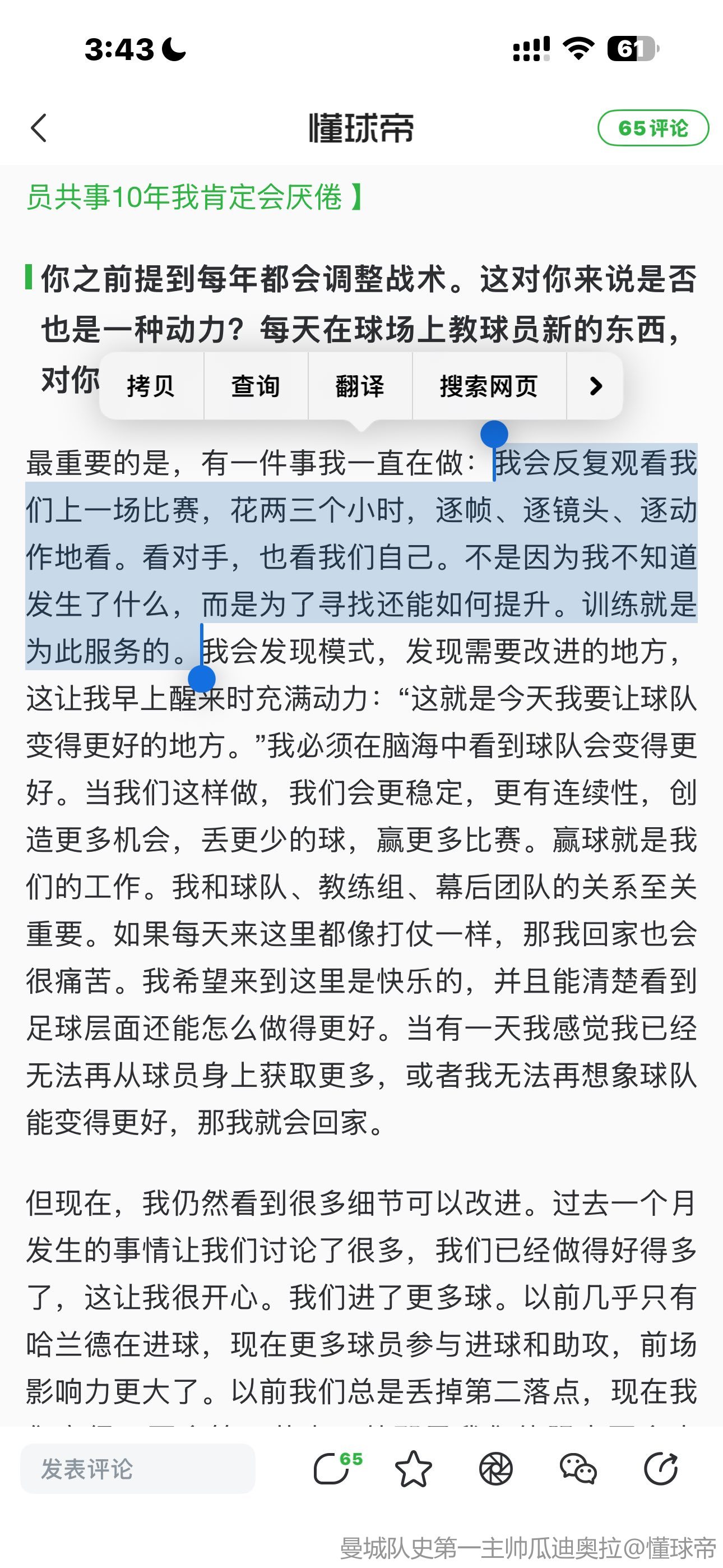 最重要的是,有一件事我一直在做:我会反复观看我们上一场比赛,花两三个小时,逐帧、逐镜头、逐动作地看。看对手,也看我们自己。不是因为我不知道发生了什么,而是为了寻找还能如何提升。训练就是为此服务的。我会发现模式,发现需要改进的地方,这让我早上醒来时充满动力:“这就是今天我要让球队变得更好的地方。”我必须在脑海中看到球队会变得更好。当我们这样做,我们会更稳定,更有连续性,创造更多机会,丢更少的球,赢更多比赛。赢球就是我们的工作。我和球队、教练组、幕后团队的关系至关重要。如果每天来这里都像打仗一样,那我回家也会很痛苦。我希望来到这里是快乐的,并且能清楚看到足球层面还能怎么做得更好。当有一天我感觉我已经无法再从球员身上获取更多,或者我无法再想象球队能变得更好,那我就会回家。