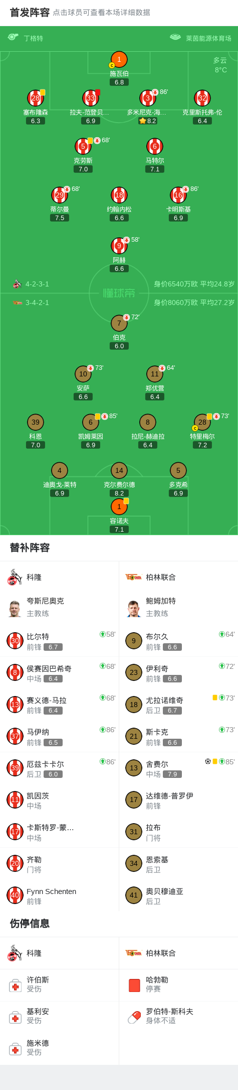 北京时间12月20日,德国足球甲级联赛第15轮展开较量,科隆坐镇主场迎战柏林联合。比赛中,科隆球员拉夫-范登贝尔赫被红牌罚下。伤停补时阶段,柏林联合球员舍费尔攻入全场唯一进球。最终,柏林联合以1比0战胜科隆。