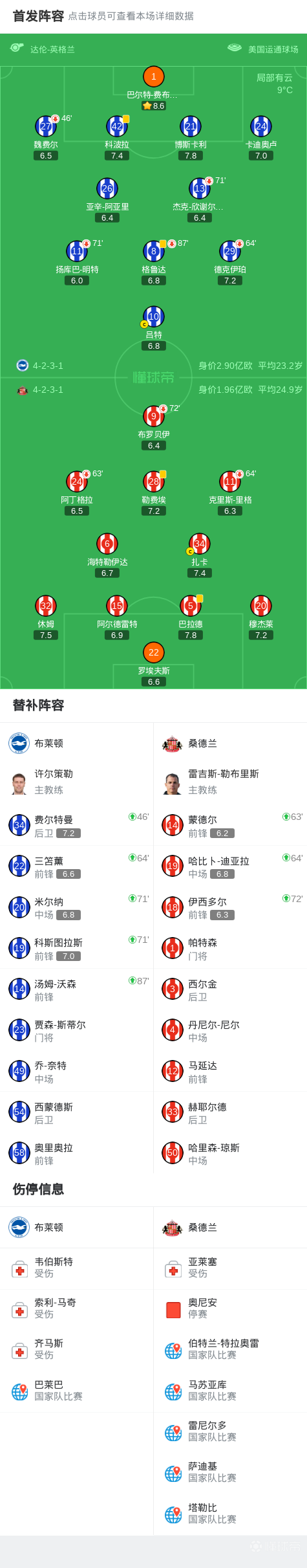 12-20 23:49布莱顿vs桑德兰:吕特、巴尔特-费布鲁亨首发,扎卡、穆杰莱出战