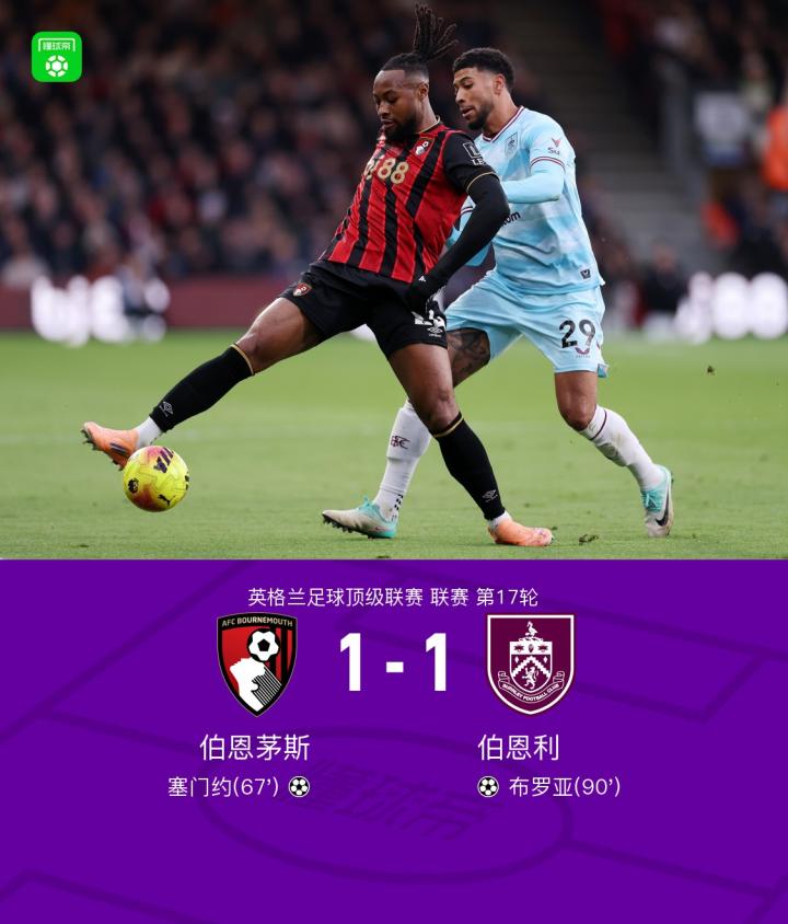 扫描下载懂球帝首页>动态> 伯恩茅斯1-1伯恩利,塞门约破门,布罗亚扳平比分